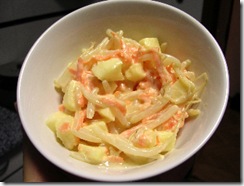 Preparación: Picar finamente la col china y echarle sal para deshidratarla durante 10 minutos. Rallar la zanahoria, la cebolla y la manzana y regar con el zumo de limón. Remover bien. En un cuenco mezclar la mayonesa con mostaza, azúcar, sal y pimienta. Mezclarlo todo y a la nevera. |